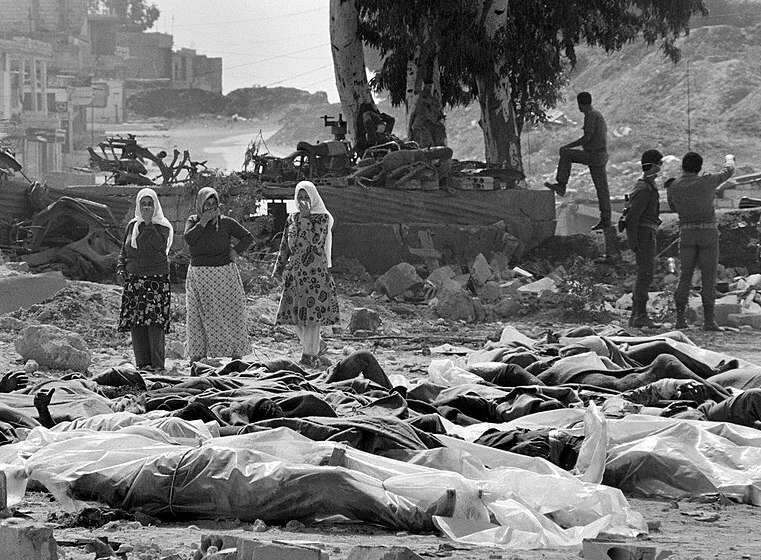 Döda kroppar staplade i Shatilalägret i Beirut den 20 september 1982. UNRWA-arkivet, fotograf okänd, CC BY-SA 3.0 IGO via Wikimedia Commons.